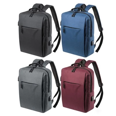 Business backpack in resistant polyester 600D material. With double puller zipper pocket and a multitude front pockets. Inside compartment with padded pocket for laptop up to 15 inches size, including USB output for charging mobile devices (cable included, auxiliary battery not included). Reinforced corners and accessories in black colour. With padded back and adjustable, padded, shoulder straps. Available in four colours. Features: Polyester 600D material, Double puller zipper pocket, Multitude front pockets, Inside compartment with padded pocket for laptop up to 15 inches size, USB output for charging mobile devices (cable included, auxiliary battery not included), Reinforced corners and accessories in black colour, Padded back and adjustable, padded, shoulder straps. Materials: Polyester. Colours: Black, Blue, Grey, Red. Size: 31 x 40 x 13 cm. Packing: Bulk. Decoration Position: Centered on pocket, In the top. Print Size: 12 x 10 cm, 10 x 5 cm.