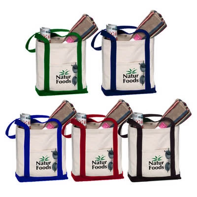 Description: Two tone boat bag with front pocket and top snap closure. 280gsm cotton canvas with coloured trim. Size: 33 (w) x 43 x (h) x 13 (d) cm. Print area: 11 (w) x 11 (h) cm. Colours: Black, Green, Navy Blue, Red, Royal Blue. Price includes: 8-10 WEEKS SEA INC 1 COL 1 POS. Setup is included.
