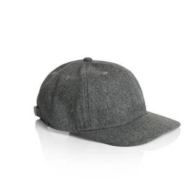 Low profile, unstructured six panel cap, flat peak. Adjustable fastener with metal clasp, tonal under-peak lining. Mid weight. Composition: 50% wool 50% recycled polyester. One size fits all. Tear-out AS Colour label