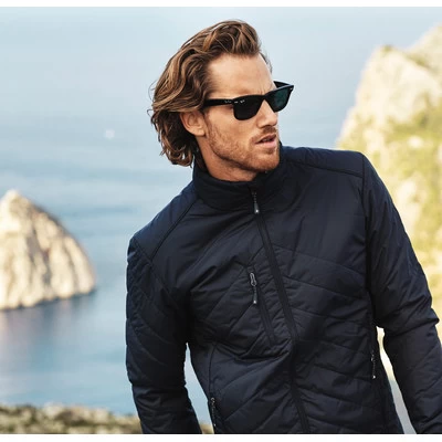 Description: Mens quilted lightweight jacket. Fully lined with hidden hood inside the collar (invisible zip). Reversed coil zip at centre front, and pockets. Elastic binding at bottom hem and sleeves. Jacket can be tucked into the front pocket which transforms into its own storage pouch. Invisible zip on the inside for ease of decoration. Shell fabric: 100% Polyester, cire finish on the inside, 56 gsm Padding: 100% PES padding (Thermolite Micro, 60gsm) Lining: 100% Nylon Colours: 600 navy, 620 metal blue, 900 black Sizes: S-3XL, 5XL