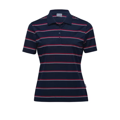 185gsm 100% polyester jacquard yarn dyed stripe, Moisture wicking, Classic fit, Flat knit collar, Twin needle detailing, DRI GEAR buttons on plaquet, Side splits at hem, DRI GEAR side pip. Colours: navy/red/white, white/navy/sky, apple/navy/white. Sizes: 8-22