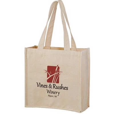Description: canvas wine/grocery tote bag with 2 sewn-in bottle holders on either side of bag. Size: 33 (w) x 33 (h) with 13 cm gussets. Print area: 21 (w) x 21 (h) cm. Colours: Natural Canvas. Price includes: 8-10 WEEKS SEA INC 1 COL 1 POS. Setup is included.