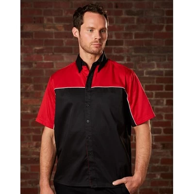 Fabric: Cotton Twill, 65% poly/ 35% cotton twill at 190 gsm Left hand chest concealed pocket. White piping across the chest and sleeves. Rubber buttons. Sizes: 1XL, 2XL, 3XL, L, M, S. Colours: Red/Black/Whitepiping, Royal/Black/Whitepiping