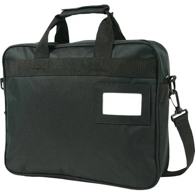 Satchel made in 600D nylon with adjustable shoulder strap. Features: 600D nylon material, Large internal compartment, Zippered side pocket, Adjustable shoulder strap, Web handles with padded velcro closure, Outer business card/ID holder. Materials: Koeskin. Size: 360 x 300 x 70mm. Packing: Bulk packed. Decoration Position: Either side of bag. Print Size: 200 x 150mm.