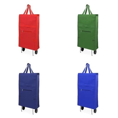 Folding shopping trolley in resistant 600D polyester, in varied range in bright tones. With matching colour reinforced nylon handles, matching colour front zipper pocket and metal stand. Small folding size. Features: Folding shopping trolley in resistant 600D polyester, Range of bright colours, With matching colour reinforced nylon handles, Matching colour front zipper pocket, Metal stand, Small folding size. Materials: Polyester. Colours: Blue, Green, Red. Size: 32 x 54 x 13.5 cm. Packing: Bulk. Decoration Position: Front face of bag. Print Size: 19 x 16 cm, 26.5 x 8 cm.