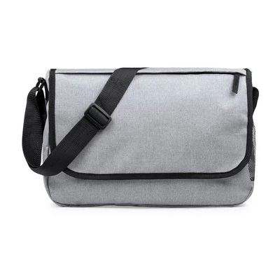 Shoulder bag with velcro flap closure in an elegant 600D polyester, gray color with black pipping. With outside pocket with zipper closure, inside mesh pocket and adjustable shoulder strap with hook closure. Materials: Polyester 600D. Size: 38 x 27 x 12 cm. Decoration Position: top flap. Print Size: 19 x 10 cm.
