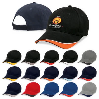 The two-tone rollback sandwich trim is designed to highlight small insignia and logos. Product Features: Rollback contrast sandwich trim with piping edge on peak, Velcro touch fastener, Heavy brushed cotton, Embroidered eyelets, Structured 6 panel design, Padded cotton sweatband, Pre-curved peak. Product. Colours: Black/White/Gold, Black/White/Grey, Black/White/Orange, Black/White/Red, Grey/White/Black, Navy/White/Gold, Navy/White/Grey, Navy/White/Orange, Navy/White/Powder Blue, Navy/White/Red, Royal/White/Navy