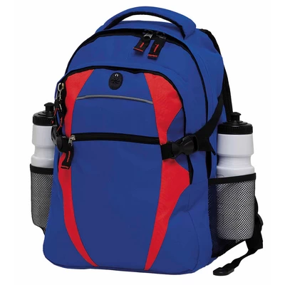 600D polyester with latex rubber backing. Two separate storage compartments. Quick stash zippered front pocket with reflective piping. Mesh backed shoulder straps and contoured padded mesh back panels. Quick release side compression straps. Dual mesh drink bottle pockets (bottles shown not included). Heavy duty zippers and accessories. Rubber feet for added protection. Mesh backed padded quick grab handle. MP3 pocket in front compartment with rubber headphone exit port. Capacity: 28 Litres. Dimensions: 32cm W x 44cm H x 20cm D. Decoration Area: Front: 90mm W x 150mm H. Colours: black/red, black/green, black/white, black/gold, black/royal, black/charcoal, maroon/white, royal/gold, royal/red, royal/white, red/white, navy/white, navy/sky, navy/gold, navy/red. Freight Details: 10 per carton, 9.2kg, 48cm L x 32cm W x 44cm H.