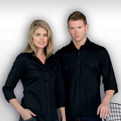 68% cotton 30% nylon 2% elastane stretch fabric, Tapered fit, Fashion collar, Metal look buttons, Epaulettes on shoulders, Shaped body detailing front and back, Buttoned breast pockets, 3/4 sleeve adjustable to short sleeve with sleeve tab, Contoured hemline. Colours: black. Sizes: 8-22