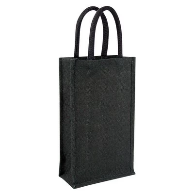 Double bottle jute wine bag with rope carry handles. Features: Double bottle, Black jute wine bag with protective inner lining, Woven rope carry handles. Materials: Jute. Size: Gusset 200 x 350 x 100mm. Packing: Bulk packed. Decoration Position: Any side of bag. Print Size: 140 x 250mm.