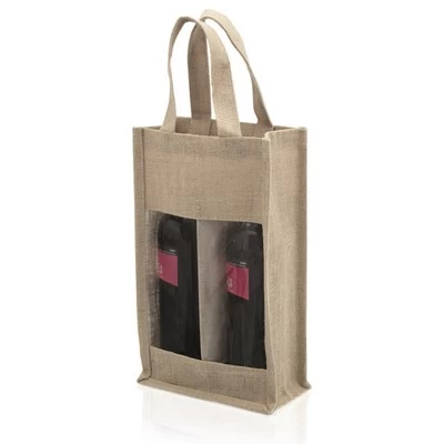 Resistant laminated jute bag with individual compartment for 2 x 750 ml. wine bottles. Transparent window, reinforced handles and piping. Features: Resistant laminated jute bag, With individual compartment for 2 x 750 ml wine bottles., Transparent window reinforced handles and piping. Materials: Jute. Colours: Brown. Size: 20 x 34.5 x 10 cm. Packing: Bulk. Decoration Position: In the left window. Print Size: 6 x 11 cm.